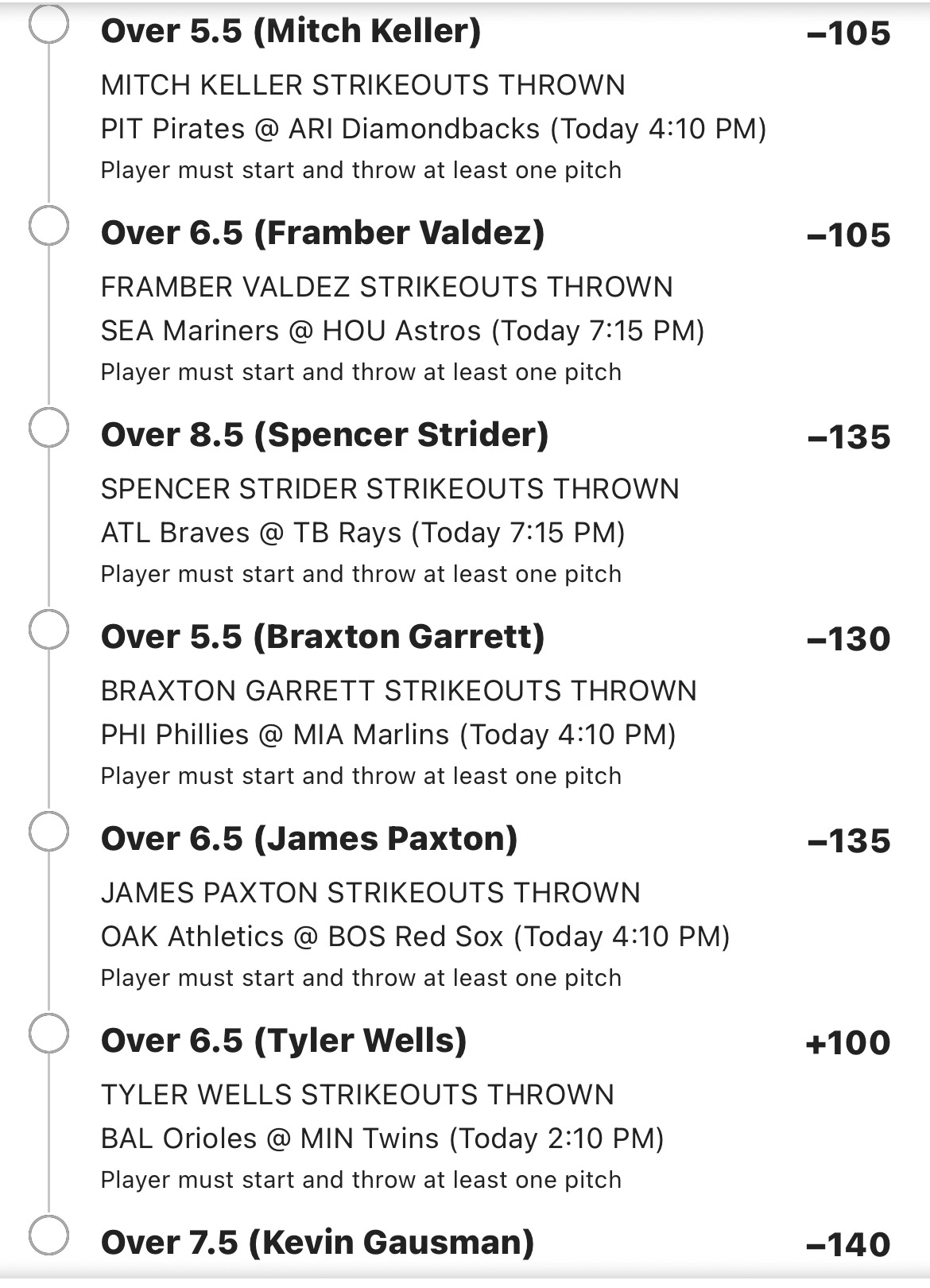The guy who I want to bet, but who isn’t posted is Reid Detmers (because the Dodgers haven’t announced a starter). I am hoping to get him over 6.5K at plus odds. 5.5K would be an easy over, but probably juiced.