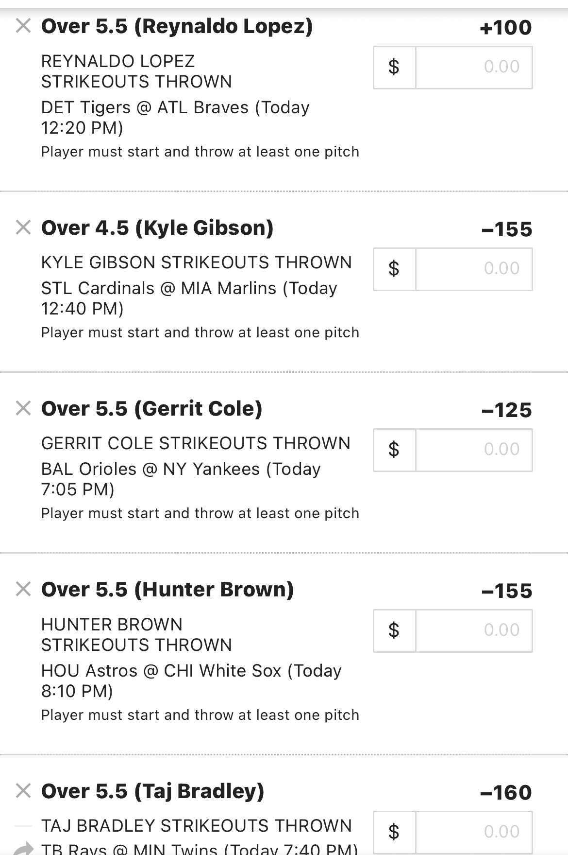 Here are the bets - in order from K props to NRFI to straight ML bets (and parlay).