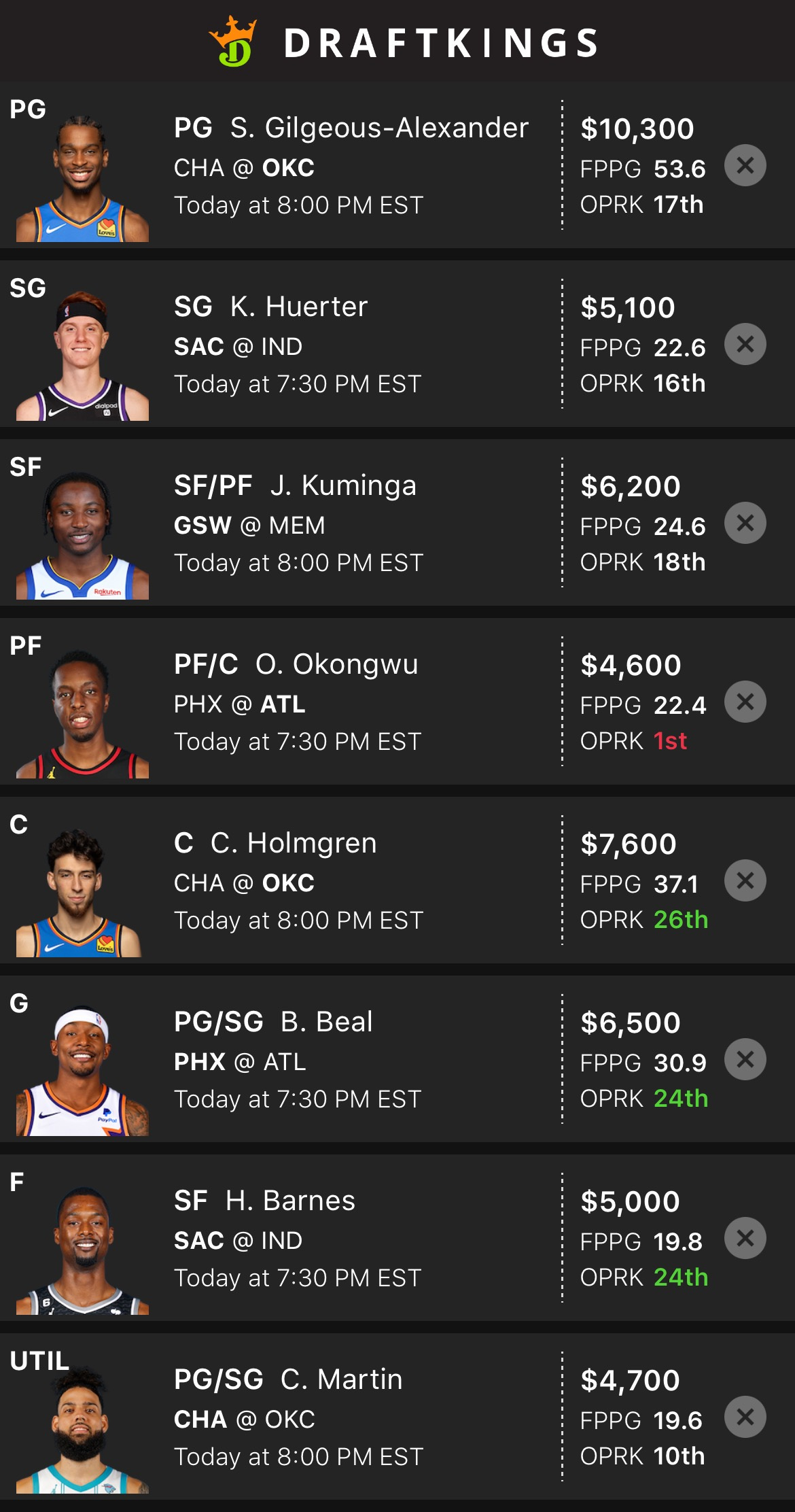 SGA is the stud to pay up for tonight. Without Jalen Williams on the floor this season he has close to a 40% usage rate and Charlotte plays absolutely zero defense.