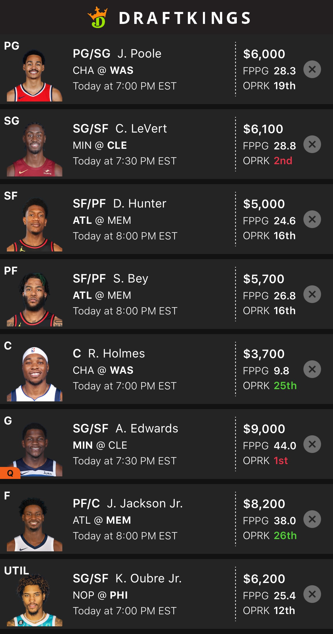 DraftKings DFS Sample Lineup