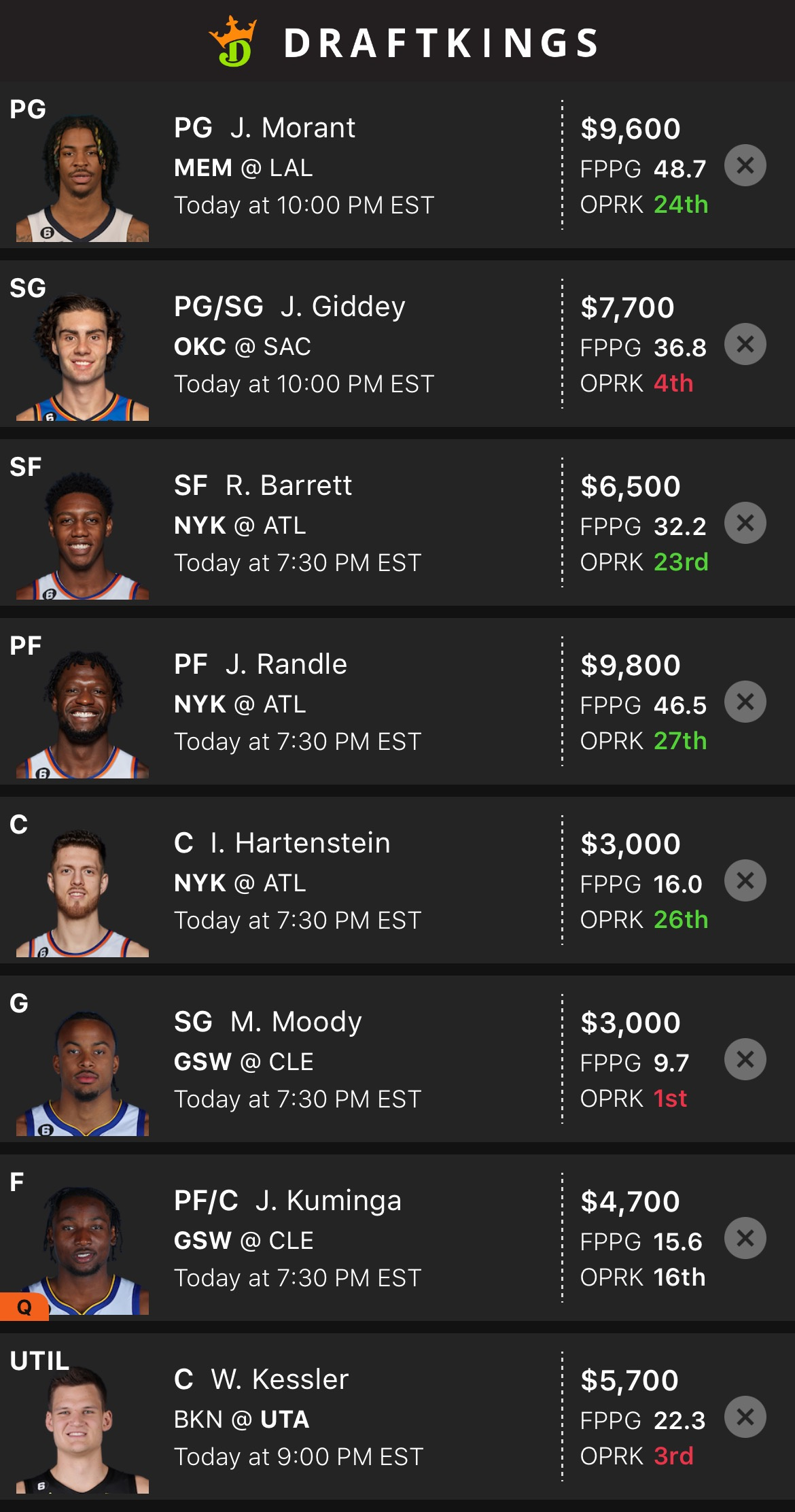 The Warriors just ruled EVERYONE out so that throws a wrench in my lineup here, but all of these guys are still really strong plays and you can mix in some Warriors value with them if you want (I have Moody and Kuminga for now)