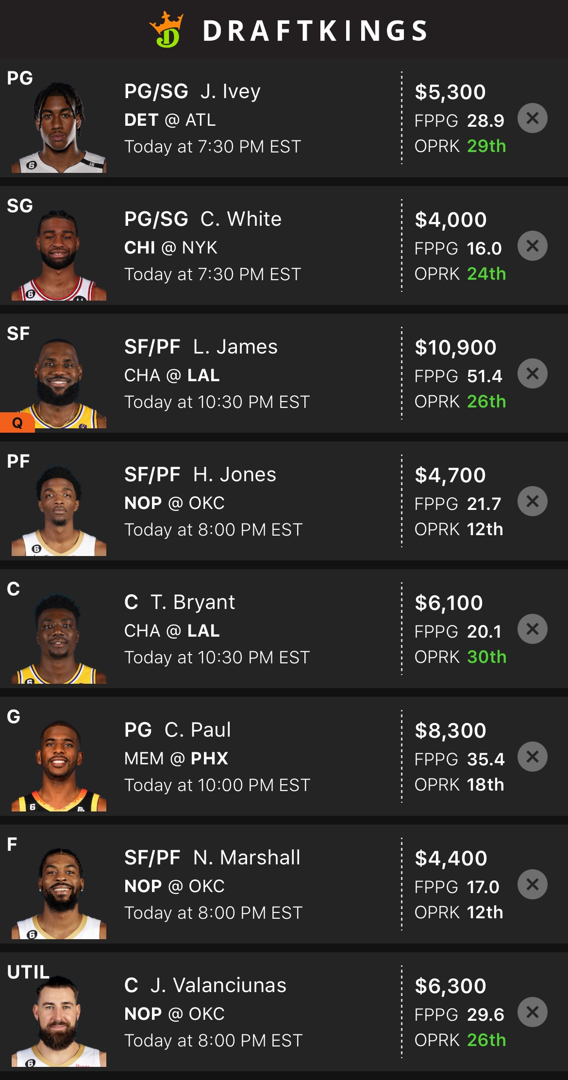 LBJ or Jokic are the top pay-ups tonight, and I like James more as I want to play a bunch of other centers for less. LBJ without AD against Charlotte - he should push for 60+ DK points again.