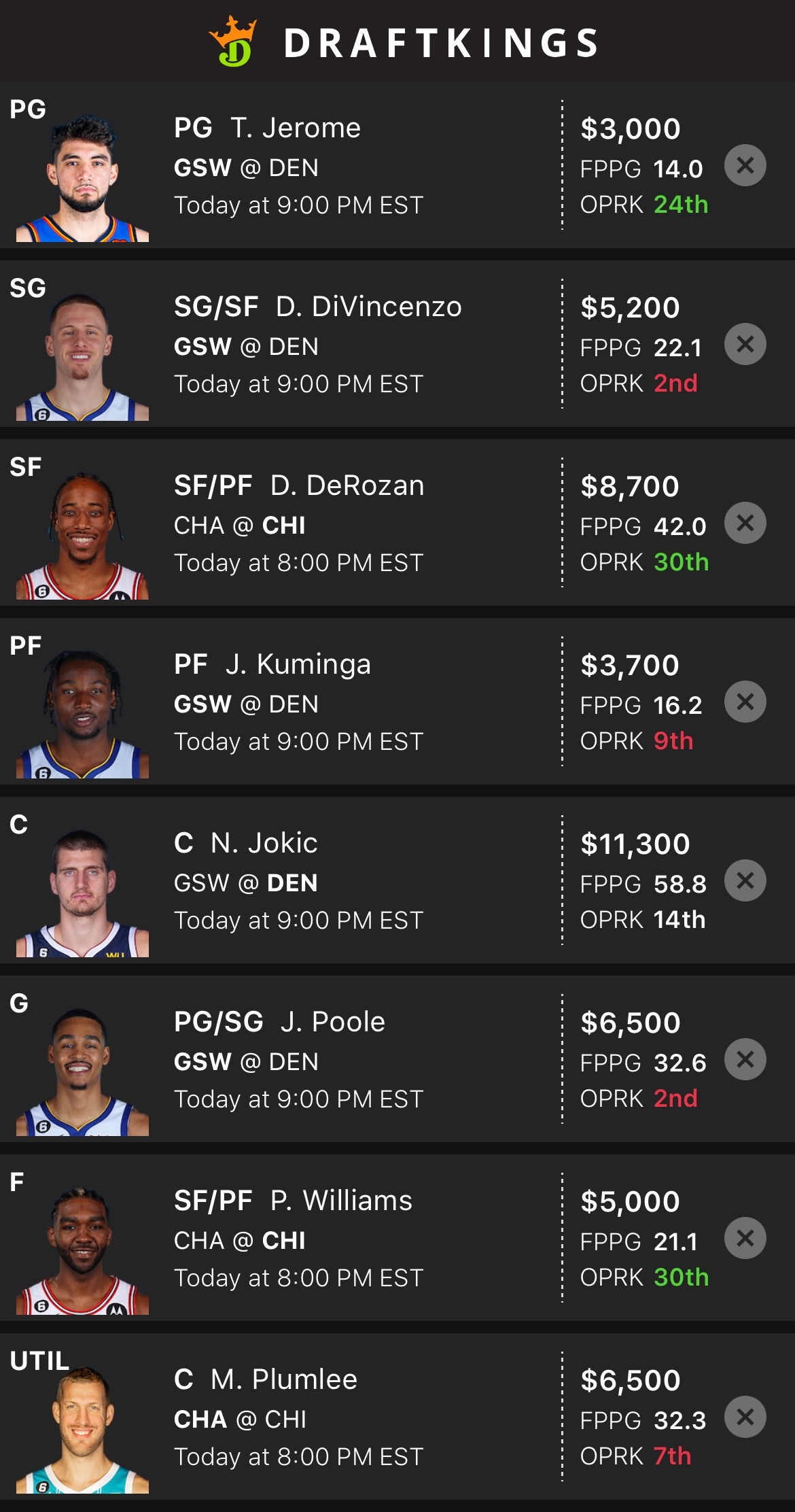 I got a handful of props again tonight and of course, as always, my DFS lineup, too. I’m targeting the Chicago-Charlotte game for my SGP and the Warriors for value in DFS.
