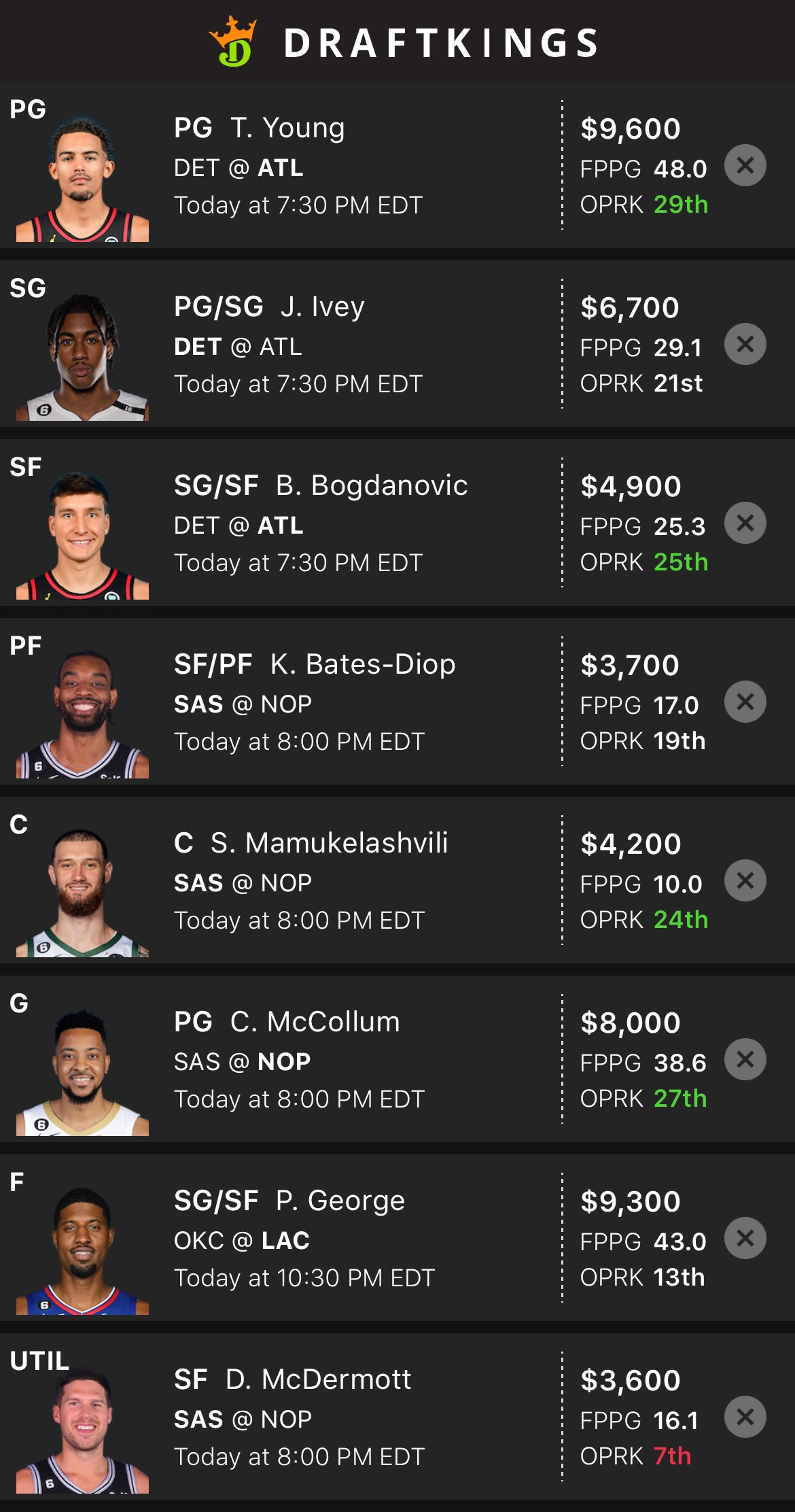 As I mentioned, a lot of Spurs and Hawks. PG13 and Kawhi are a coin flip for me, but I kind of want one of them against OKC and George has a similar floor/ceiling as Kawhi for less.