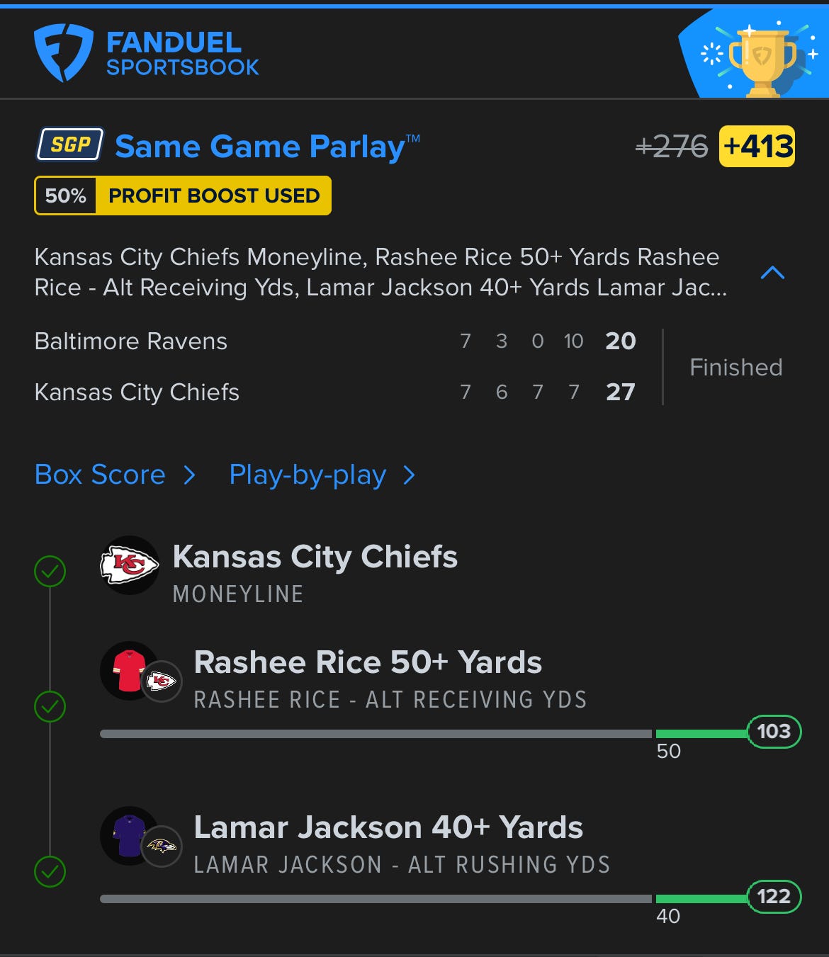 So the Chiefs did cover three points, while Lamar and Rice both smashed their individual props. It’s a beautiful thing when the props all hit and we can hit a nice SGP, too.