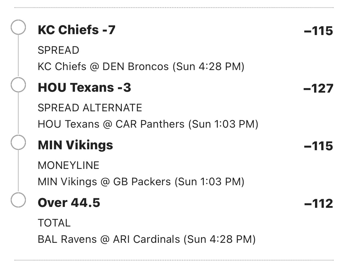 Chiefs are the most points I have laid on a favorite all season. Note that I bought a half point on the Texans, the current spread is -3.5 and I hate that extra half-point, so I ate some juice.